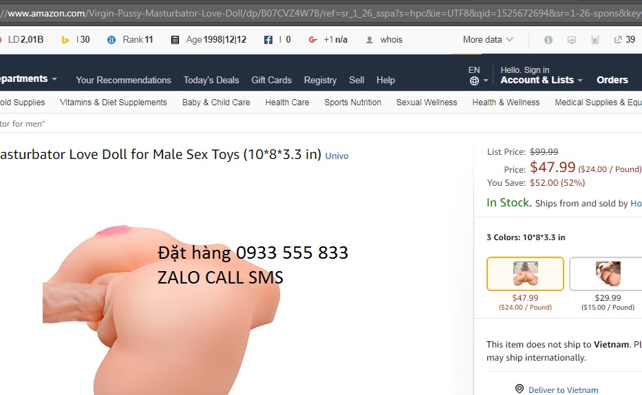 Sản phẩm âm đạo giả silicon USA đang được bày bán trên amazon của Mỹ phân phối đi nhiều quốc gia trên thế giới với giá bán lẻ gần 50 đô la chưa phí ship